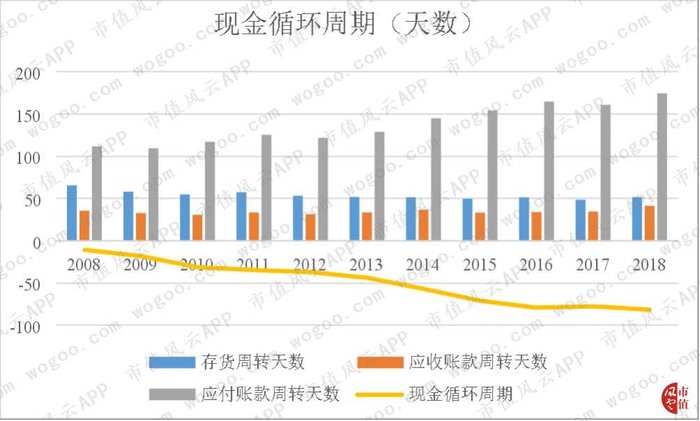 现金循环周期在图中走势稳定的负斜率可真是令人兴奋(手动滑稽)。