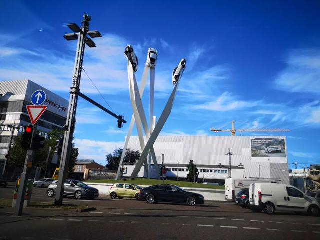 这里不光是它的博物馆,而几乎是整个保时捷的地盘。如你所看,环岛耸立了三辆保时捷直冲云霄的雕塑,而以环岛为圆心的四周,一边是保时捷的传奇工厂,一辆辆全新911开上板车,正准备发往全球各地,还有日后即将亮相的电动车Taycan,也在这里生产;另一边是全德国最大的保时捷4S店;再另一边就是保时捷博物馆和维修车间。
