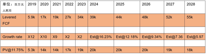 以上是京东未来10年自由现金流的预测,接下来计算终端价值(Termianl Value)。由于多种原因,分析师使用非常保守的增长率即不超过本国GDP的增长率。使用11.7%的权益成本将未来现金流折算到今天的价值。