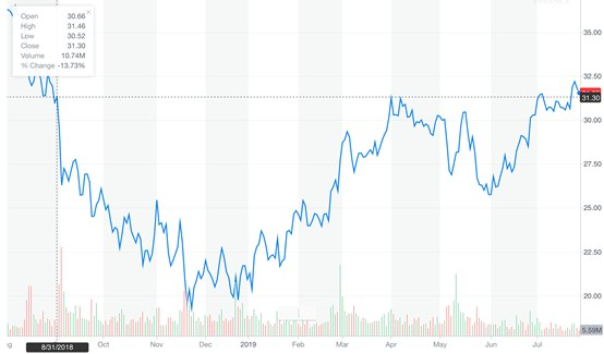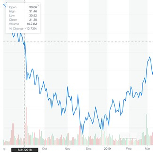 在2018年8月底刘强东性侵门爆发前一个交易日,京东的股价为31.30美元,丑闻爆发后的首个交易日股价一天内暴跌至26.30美元,随后一路跌至过去一年低点19.27美元,市值损失近四成。