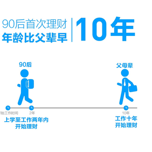 在“钱生钱”这件事上,90后比自己的父母更为积极。90后首次开始理财的年纪平均是23岁,绝大部分人会在上学至毕业后的两年内就接触理财,父母辈第一次接触理财早了整整10年。余额宝数据还显示,90后人约月转入余额宝高达8次,平均比自己的父辈高2次,月均存钱也比父母平均多出1000元。随时有钱、随时理财是他们的习惯。