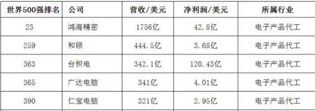 而随着世界500强的发布,我们发现全球前5大代工企业,均是世界500强,并且全在中国台湾,还全和苹果有关系。