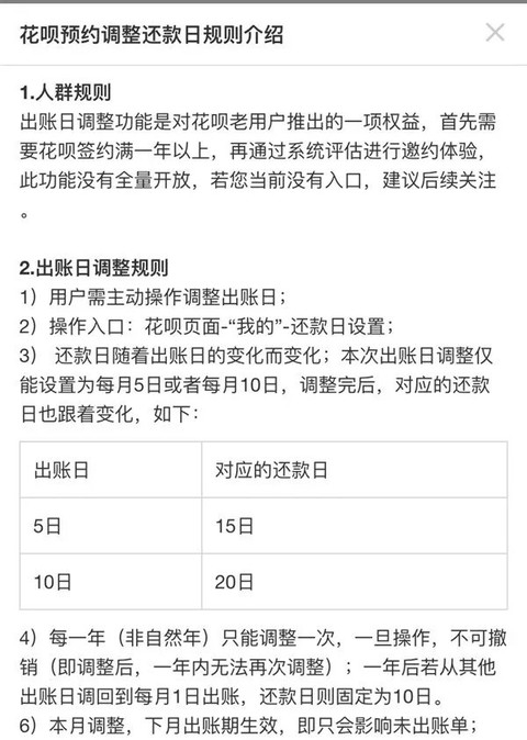 据介绍,目前能够预约修改还款日的限制为条件为:花呗签约满一年以上的用户,并且经过系统评估,方可通过支付宝APP花呗—我的—还款日设置,选择自己希望的还款日期,为每月的15日或者20日,同时花呗的出账日期将调整至每月的5日或者10日。当然,用户也可以选择不调整日期。