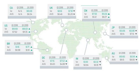 从全球市场来看,2019年第一季度首次展示eCPM收入最高的是美国市场,达到16.03美元,其次是中国市场14.04美元,其余依次是日本(12.86美元)、澳大利亚(12.18美元)、加拿大(10.08美元)、德国(7.53美元)、英国(7.18美元)、巴西(1.71美元)和印度(0.32美元)。