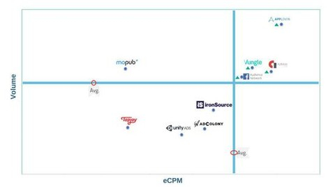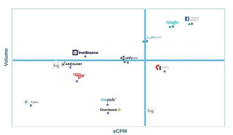 上图展示的是美国插屏广告十大广告网络的展示量和变现能力排名,从坐标轴来看,美国市场的插屏广告表现最好的是AppLovin,该平台无论是收藏展示量还是eCPM收入都遥遥领先,此外,Vungle、Admob、Facebook三家也远远高于平均水平(注:坐标交叉点并非平均值)。