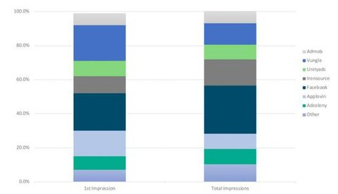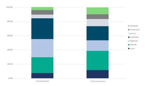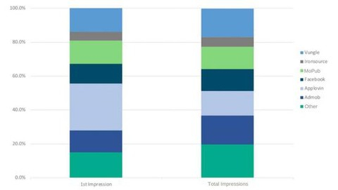 上图是各个广告平台在美国激励视频广告领域的展示量份额,左侧是首次展示量分布,右侧为总展示量分布。