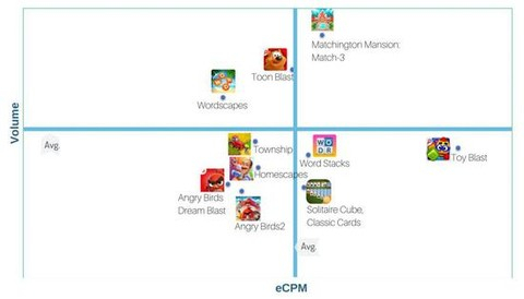 以上是美国iOS平台激励视频广告十大广告主在流量和eCPM方面的排序,《消消庄园:三消》是惟一一个收入和流量都比较高的产品,而《Toon Blast》实际上与之非常接近。