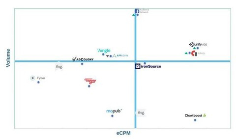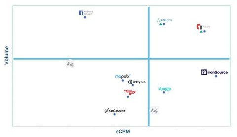 这部分对比的是不同广告网络的变现效率,我们主要通过插屏广告和激励视频广告的流量以及eCPM对比,本报告对比覆盖了27个广告网络,但象限坐标图只展示Top 10。
