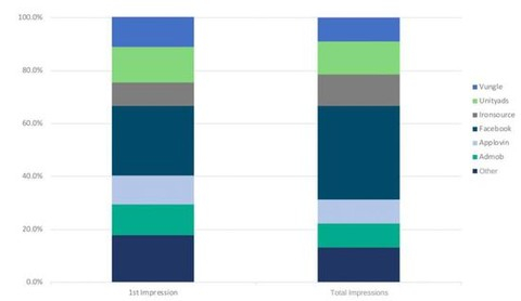 和美国不同的是,Facebook在其他地区仍是首次广告展示量最多的平台,谷歌的Admob则在总展示量方面领先,AppLovin的首次展示浏览量在全球市场占比也很高。