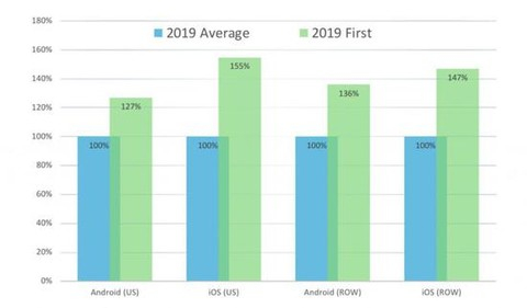 需要注意的是,根据报告来看,首次展示带来的收入是非常可观的,任何一个市场的首次广告展示eCPM都比平均值高50%以上,日本市场这两个数据的差别几乎翻倍。