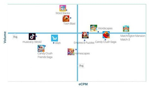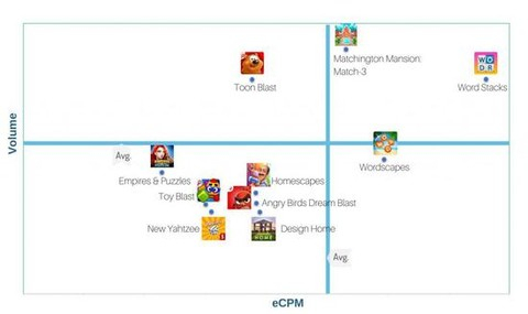 上图是美国iOS顶级广告主在展示量和eCPM之间的对比,从结果来看,《消消庄园》和《Word Stacks》遥遥领先。