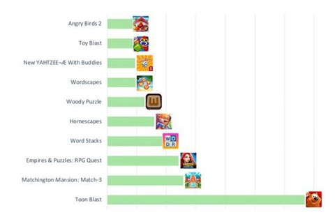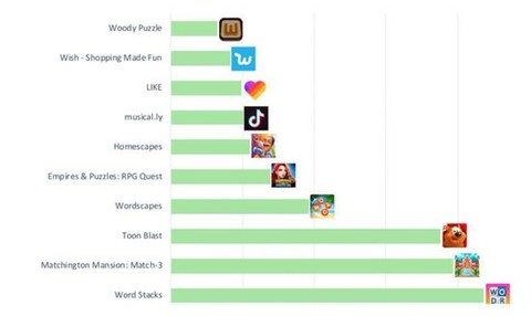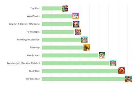 首次展示量排名前10名有7款都是手游,前三名分别是《Word Stacks》、《消消庄园》和《Toon Blast》,其余四款分别是《Wordscapes》、《帝国与谜题》、《梦幻家园》和《Woody Puzzle》。