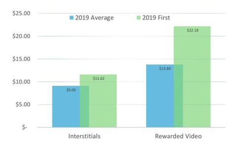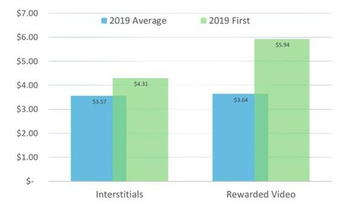 在全球其他市场,插屏广告首次展示带来的eCPM收入平均4.31美元,激励视频广告首次展示的eCPM收入平均是5.94美元。