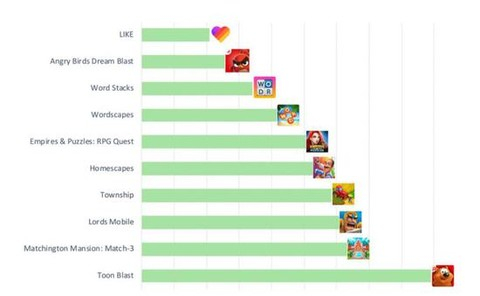 激励视频总展示量广告主排名方面,《Toon Blast》排名第一,《消消庄园:三消》和《王国纪元》分别居第二和第三位,前十名其他广告主依次是:《梦幻小镇》、《梦幻家园》、《帝国与谜题》、《Wordscapes》、《Word Stacks》、《Angry Birds Dream Blast》和《LIKE》。