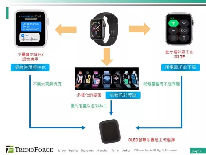 如前文提及,在目前智慧手表的使用情境下,屏幕使用频率并不高,面板省电带来的效益亦不多,更何况 LTE 版 Apple Watch 并非市场主流产品,消费者依旧购买蓝牙版 Apple Watch,因此大部分消费者不会面临 Apple Watch 电池续航力不足情况;而 Apple Watch 4 虽然改采用 LTPO OLED 屏幕,却没有增加电池容量,反而扩大屏幕尺寸,代表短时间内,电池续航力不是困扰 Apple Watch 的主要因素。