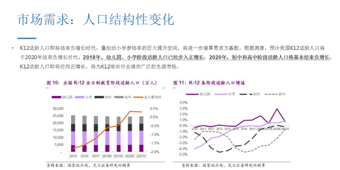一大利好的消息是K12的人口结束负增长,2018年的时候幼儿园、小学阶段已经正增长,预计在2020年初高中阶段人口结束负增长,迈向增加生源的市场。这对教育行业是重大的利好,包括二胎的政策、人口红利的政策都在促进整个教育基本面的“扩大饼”。