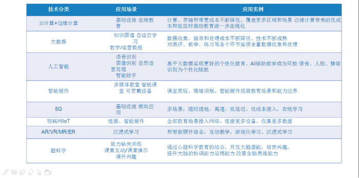 目前来看,自适应、深度学习、5G通信、人工智能会在一整块模块带来革新。上文中提大数据、AI,再提AR/VR混合现实技术,是在教育行业中对“教”和“学”都有用的技术。例如,我们此刻坐在课桌戴上眼镜,打开AR模块可能看到巴黎的学生也在教室里面,这将比直播技术更加有沉浸性,而沉浸式的体验会提升学习的效果。