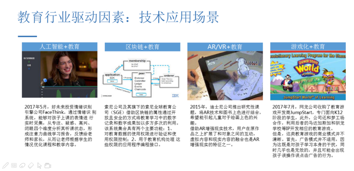 第四个,游戏化+教育,游戏化可以跟AR/VR结合在一起,两者是娱乐化的教育过程。这两个商业模式一加会有新的想法。
