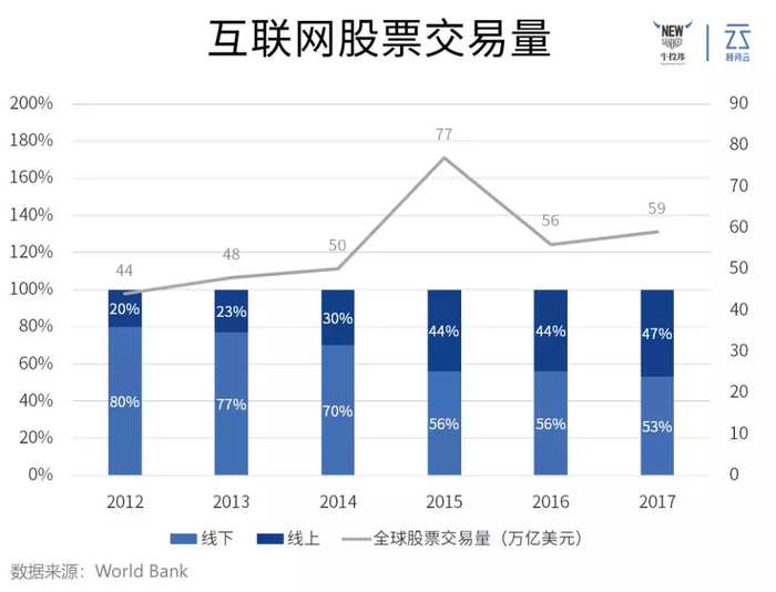 据统计,全球线上证券交易在2012年只占全球股票总交易量的20%;但是到了2017年,就占到了全球股票总交易量的47%。
