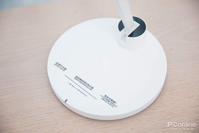 底座和灯头一样,同样采用的是圆形设计。表面为复合材料,磨砂的工艺摸起来很有质感。台灯的电源开关、线性触控调光指示条以及智能护眼键均放置在底座的上方,保护膜贴心地标注了每个键的位置和功能,使用起来很方便。