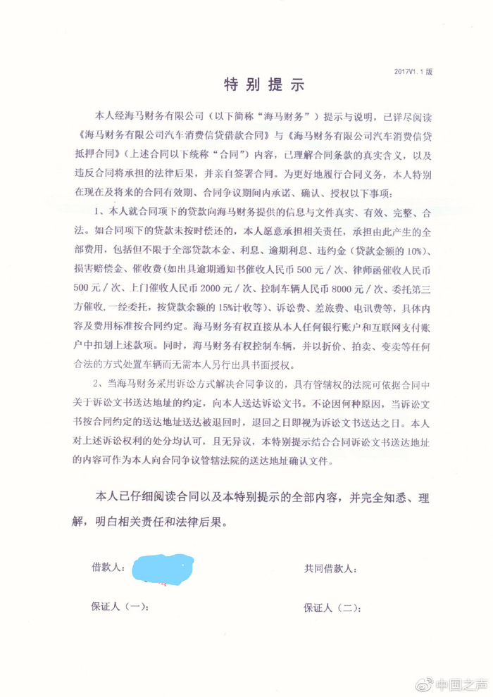 消费者:海马公司迷你字体合同包含霸王条款