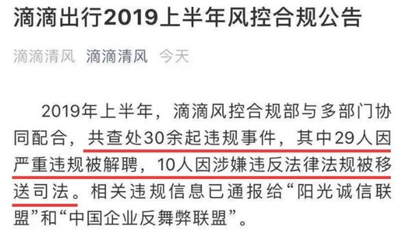 滴滴出行8月2日也公布了2019上半年内部反腐败、反舞弊事件的相关情况。公告显示,滴滴在2019年上半年查处30余起内部违规事件,有29人因严重违规被解聘,其中10人因涉嫌违反法律法规被移送司法。