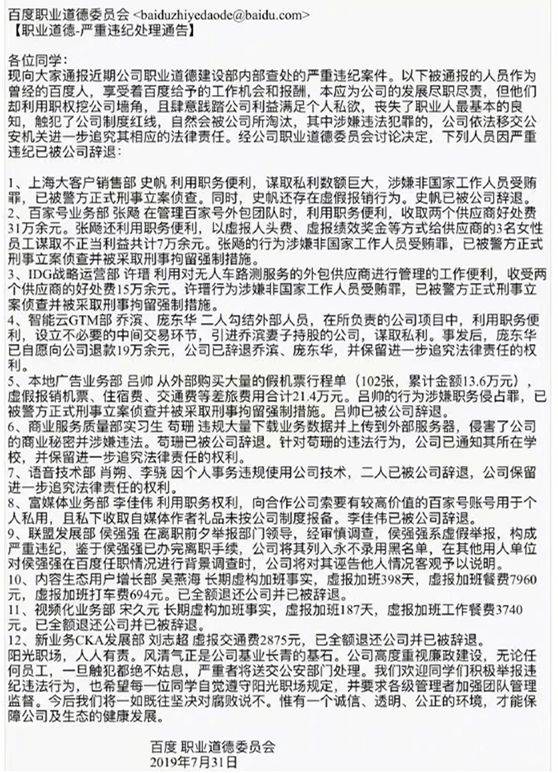百度职业道德委员会近日通报了12起内部腐败事件,其中包括受贿、侵犯商业秘密等违法行为,也包括虚假报销、虚报奖金的违纪行为。涉事14人均已被辞退,部分员工被警方正式刑事侦查并采取强制措施。