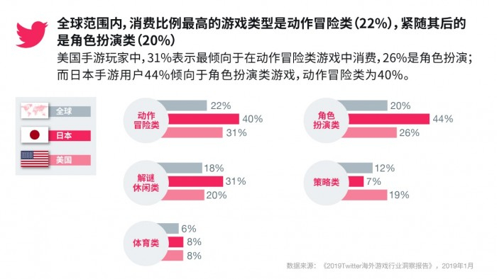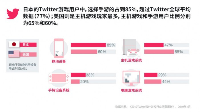 此外,日本的Twitter游戏用户中,选择手游的占到85%,超过Twitter全球平均数据(77%);美国则是主机游戏玩家最多,主机游戏和手游用户比例分别为65%和60%。