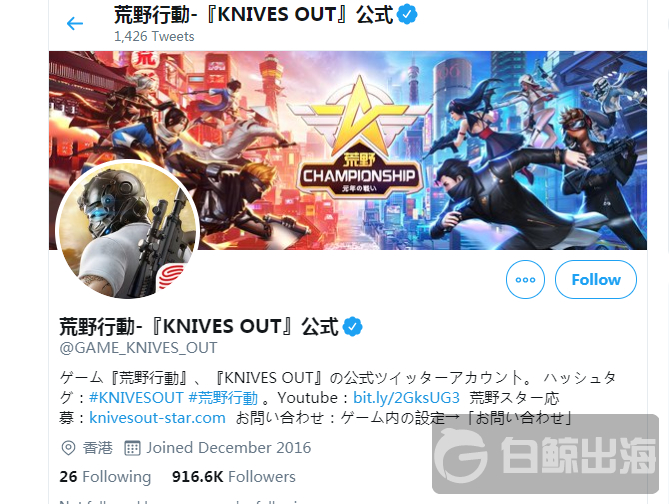 荒野行动的Twitter官方账号已经有将近100万日本粉丝