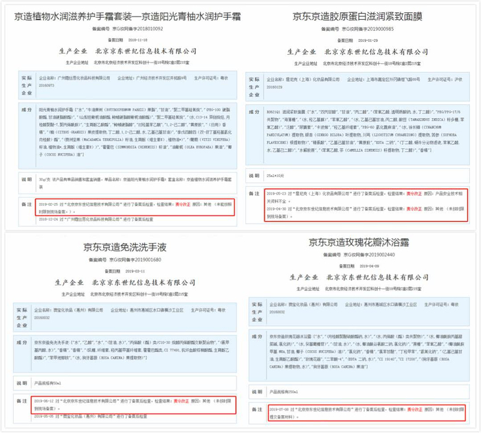 其中,京东京造于2019年4月19日备案的一款名为“京东京造冰藻控油细致爽肤水”的产品,实际成分一栏中却标注的是“个人定制润色腮红(甜心草莓)”的产品名。而其在相关部门于2019年7月16日的备案后检查结果为“责令改正”,原因为“未按时限提供备案材料”。