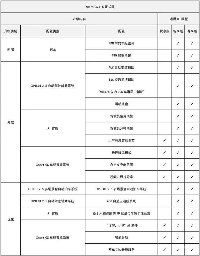 从7月28日起,小鹏正式向2019款G3用户分批推送Xmart OS 1.5版本OTA 升级软件。据小鹏自动驾驶高级产品经理黄鑫介绍,此次小鹏G3(智享版、尊享版)OTA包括自动驾驶系统与人工智能功能的升级。自动驾驶系统包括: