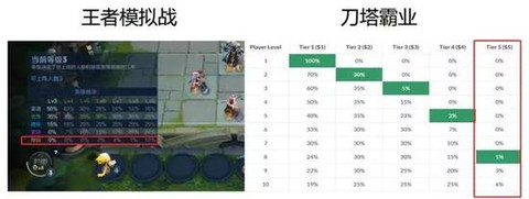 首先,游戏压缩了自走棋产品的等级设定,直接从lv3开始,这就好比《Artifact》当初为了加快游戏节奏直接从3费开始一样。压缩等级的同时,对比王者模拟战和同类游戏的抽卡概率设定可以发现,本作还增加了同等级可抽取高等级英雄的概率。显然,这也有利于加快游戏的进程,另一方面由于等级对于阵容强度的影响更大,还会加大游戏的策略深度,达到“易上手、难精通”。