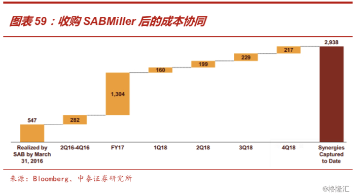 (5)2016年:收购第二名SABMiller,进入高成长非洲市场。A-B InBev收购了第二大啤酒公司SABMiller,新公司的啤酒销量超过2-4名总和。收购SABMiller弥补了百威英博在非洲、印度、澳大利亚、南美洲西部地区的空白。2016-2018年,公司已累计实现29.38亿美元的成本协同。