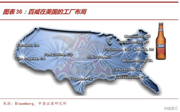 A-B拥有一流的生产能力,并持有Modelo集团50.2%的股权。A-B的年产销量超过1500万千升,而在美国仅有12家工厂,单个工厂的规模优势明显。同时A-B持有Modelo集团50.2%的股权,Modelo在墨西哥(全球第三大啤酒利润池)占据56%的市场份额。