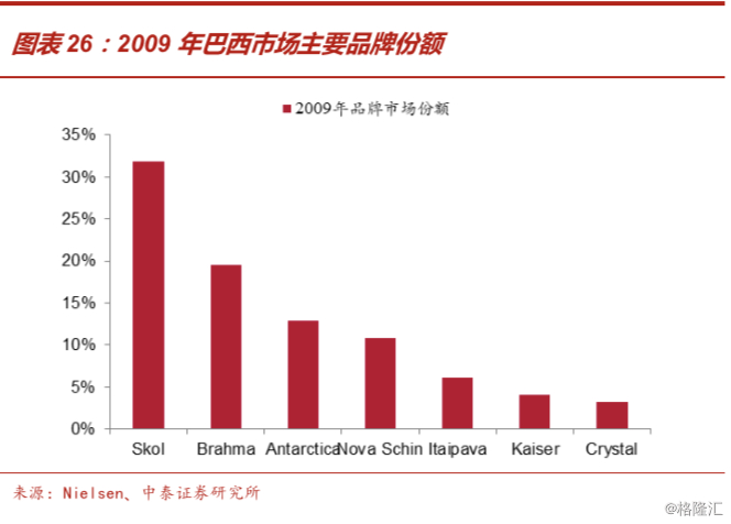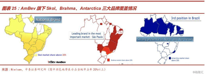 InBev在巴西拥有强大的品牌组合,包揽巴西前三大品牌。AmBev旗下拥有Skol、Brahma、Antarctica三大品牌,为巴西啤酒市场前三大品牌。Skol为巴西的国民品牌,定位年轻消费群体,代表时尚和创新,市占率从1995年的14.6%提升至2005年的32.1%;Brahma是巴西第二大品牌,在重要的圣保罗市场占据领导地位,定位男性友谊;Antarctica则在北部市场表现突出。
