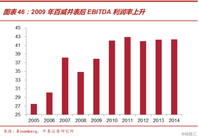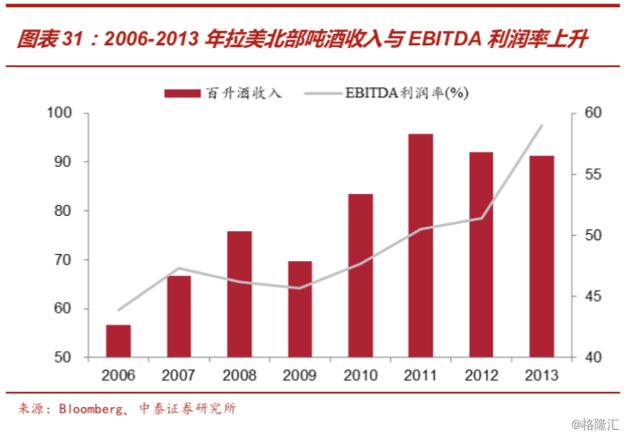 并购整合后的2006-2013年,公司在拉美北部(包含巴西)的百升酒收入与EBITDA利润率均有明显上升。
