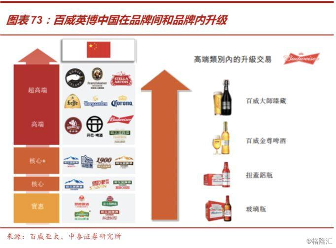 百威英博在品牌间和品牌内升级。百威英博在中国的品牌分为五档,超高端包括Corona、时代、福佳等进口品牌及鹅岛等精酿品牌;高端主要是百威、哈啤高档品牌及拳击猫等精酿品牌;核心+以哈啤冰纯等中高档哈啤为主;核心主要为老哈啤、雪津等;实惠为双鹿、金士百等。百威英博通过品牌间的升级来提升产品结构。另一方面,百威英博也在品牌内进行升级,从百威玻瓶到百威铝瓶再到百威金尊甚至百威大师。