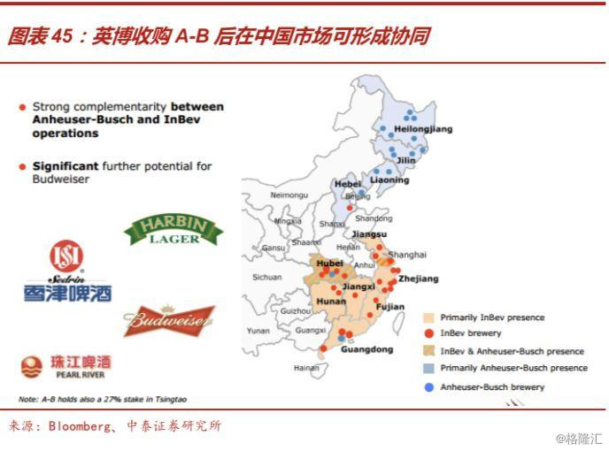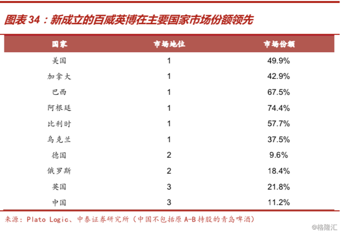 A-B与InBev的优势市场形成互补,加固全球龙头地位。InBev的市场主要分布在南北美、欧洲、亚太,而A-B超过80%的销量来自于美国。合并前InBev在美国的市占率不到2%,A-B在美国市占率达到48.5%,收购A-B奠定了公司在美国市场的领先地位。在中国,A-B与InBev的啤酒业务也可以进行良好的协同。在主要的啤酒消费国中,新成立的百威英博在美国(全球第二)、巴西(全球第四)、加拿大、阿根廷、比利时、乌克兰的市占率均达到第一;在俄罗斯(全球第三)、德国(全球第五)的的市占率第二;在中国(全球第一)、英国的市占率第三。