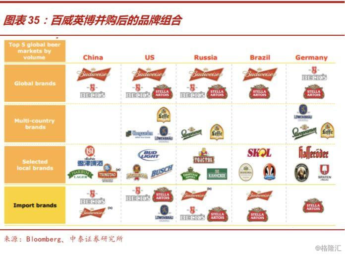 收购A-B大幅强化了公司的品牌组合,收获全球顶级品牌Budweiser(百威)。A-B拥有Bud Light和百威两大美国畅销品牌,并购后的新公司在产品组合上得到极大增强,形成了更丰富的全球品牌、多国品牌、当地品牌的梯队。百威品牌可以借助英博原有的资源向前五大市场中的中国、俄罗斯、巴西进行推广,同时可将英博原有的全球品牌Stella Artois、BECK’S在美国进行推广。
