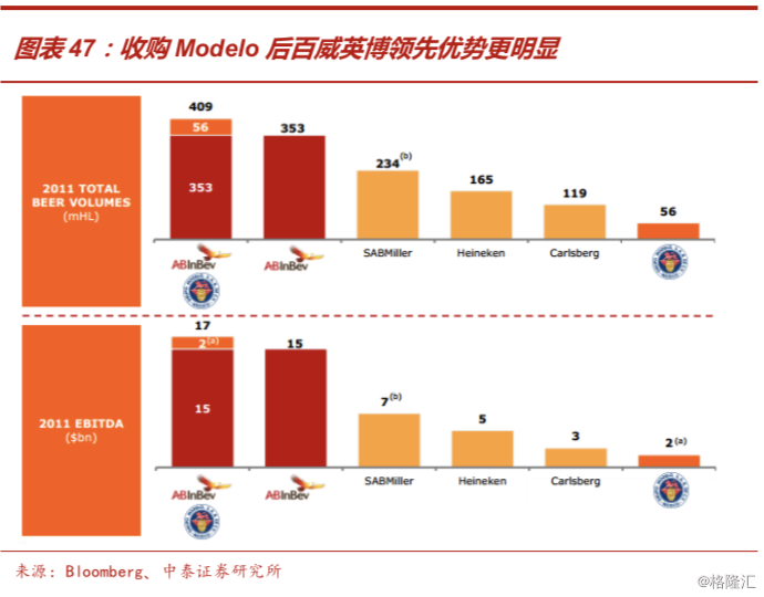 收购墨西哥Modelo,百威英博领先优势扩大。A-B原持有Modelo集团50.2%的股权,但未控股。2012年百威英博收购了Modelo,从销量和EBITDA看,公司与第二名SABMiller的差距进一步扩大。