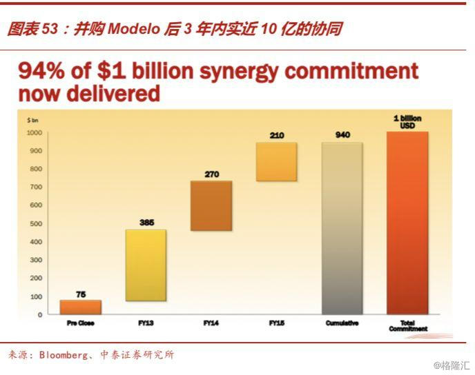 百威英博收购Modelo后,通过其全球分销网络进一步扩大Corona在全球的销售,实现显著的收入协同效应。同时通过输入百威英博的管理模式及理念,规划2016年前实现10亿美元的成本协同,而至2015年已实现了9.4亿美元,目标提前完成。