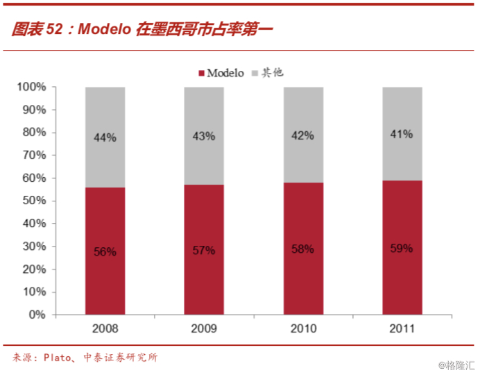 Modelo在墨西哥市占率第一。2008-2011年,Modelo在墨西哥的市占率从56%提升至59%,领先优势明显。旗下Corona品牌是墨西哥的领先品牌,体量接近第二大品牌的两倍。