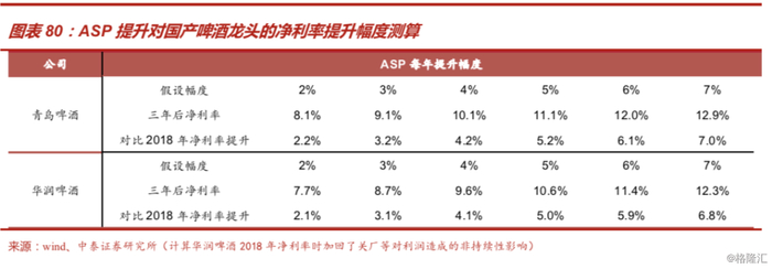 若三年ASP保持5%的CAGR,假设其他条件不变,则青啤和华润的净利率有望翻倍。百威英博在中国的盈利能力远高于国产品牌,部分受益于其高端定位及持续的ASP提升。未来啤酒行业发展的核心驱动因素是结构升级推动ASP提升,因此我们假设其他条件不变,仅考虑ASP提升的情况下龙头公司三年后的净利率提升幅度。按4-5%的中性ASP提升速度测算,三年后青岛啤酒和华润啤酒的净利率均可提升4-5个pct,对比2018年净利率水平接近翻倍。(计算华润啤酒2018年净利率时加回了关厂等对利润造成的非持续性影响)
