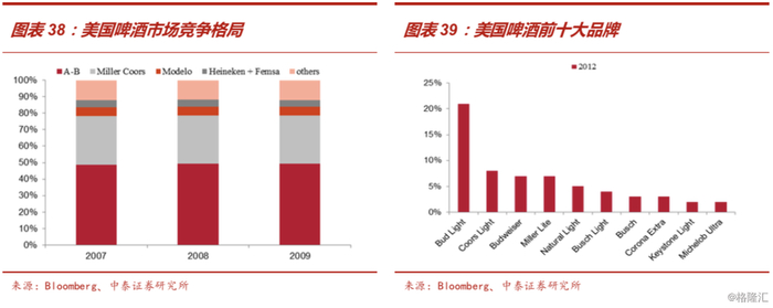 百威英博在美国市场份额处于领先,拥有众多的优势品牌。1983-2003年A-B在美国的市场份额从33%持续上升至50%左右,2003-2007年受精酿啤酒冲击A-B市场份额出现下滑,2007年以后公司加大产品创新,市场份额回升。从竞争格局看,A-B市占率一直保持在接近50%,第二名Miller Coors(SABMiller和MolsonCoors合资)的市场份额接近30%,三四名Modelo和Heineken的份额均只有5%左右,A-B的龙头地位较稳固。2012年美国前十大销量的啤酒品牌中,百威拥有Bud Light、Budweiser、NaturalLight、BuschLight、Busch、MichelobUltra共6个。