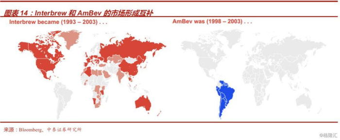 Interbrew和AmBev的市场在地理上形成互补。2003年前Interbrew的主要市场在欧洲,并布局了北美和亚太,在南美没有布局;而AmBev的市场均在南美,尤其是巴西,AmBev是南美啤酒龙头。