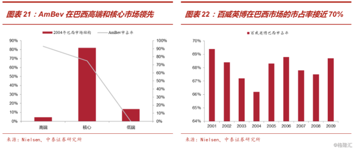 (2)2004年:收购AmBev成立InBev,奠定南美霸主地位。AmBev是南美啤酒龙头,在地理上形成互补。合并后的InBev在超过20个国家市占率前二,南美市场占据领导地位。巴西是前五大啤酒消费国,兼具量增和结构升级。InBev在巴西市占率接近70%,而第二名份额未超过15%。InBev主要定位中高端,在高端市场的份额达93%,核心市场的份额达75%,符合消费升级,同时InBev包揽了巴西前三大品牌Skol、Brahma、Antarctica。通过重构销售组织构架提升效率,2006-2013年拉美北部(含巴西)的百升酒收入与EBITDA明显上升。