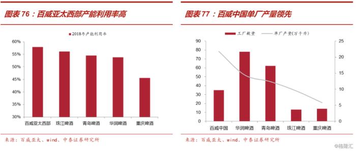 百威亚太西部(百威中国)运营效率领先。2018年百威亚太西部产能利用率为58%,高于国内啤酒企业;2018年百威中国单厂产量为22万千升,远高于国内啤酒企业,规模优势明显;2018年百威中国人均销量为292千升,仅次于重庆啤酒。