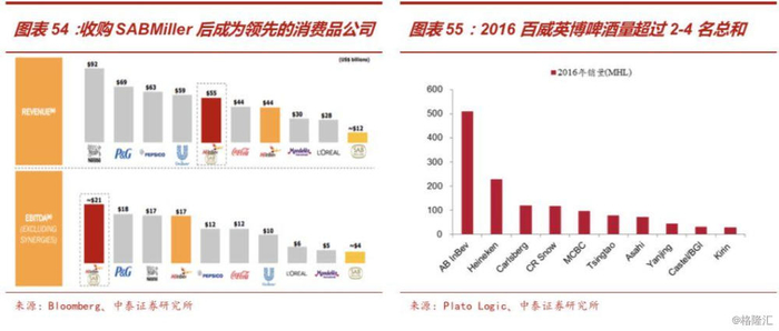 收购SABMiller奠定了公司在啤酒乃至消费品公司中的领先地位。2016年A-B InBev收购了第二大啤酒公司SABMiller,新成立的公司在消费品公司中收入位列第五,EBITDA位列第一。在啤酒行业中,2016年新的百威英博啤酒销量超过了2-4名喜力、嘉士伯、雪花的总和,成为当之无愧的啤酒霸主。