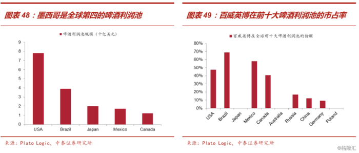 墨西哥是全球第四大啤酒利润池,收购Modelo后百威英博在全球前五利润池中的四个国家市占率第一。美国、巴西、日本、墨西哥、加拿大是全球前五大啤酒利润池,收购Modelo后,除了在美国、巴西、加拿大市占率达到第一,公司在墨西哥的市占率也达到第一。在利润池市场的强劲表现使公司的盈利能力高于竞争对手。