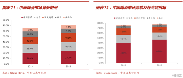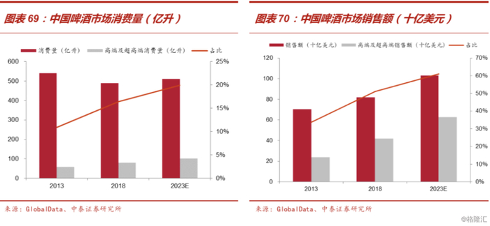 从销售额看,2013-2018年我国啤酒销售额从70.3上升到81.8十亿美元,CAGR为3.1%;高端及超高端销售额从23.7上升至41.8十亿美元,CAGR为12.0%;高端及超高端销售额占比从33.7%提升至51.1%。预计2018-2023年啤酒销售额从81.8上升到102.9十亿美元,CAGR为4.7%;高端及超高端销售额从41.8上升至62.7十亿美元,CAGR为8.5%;高端及超高端销售额占比从51.1%提升至60.9%。
